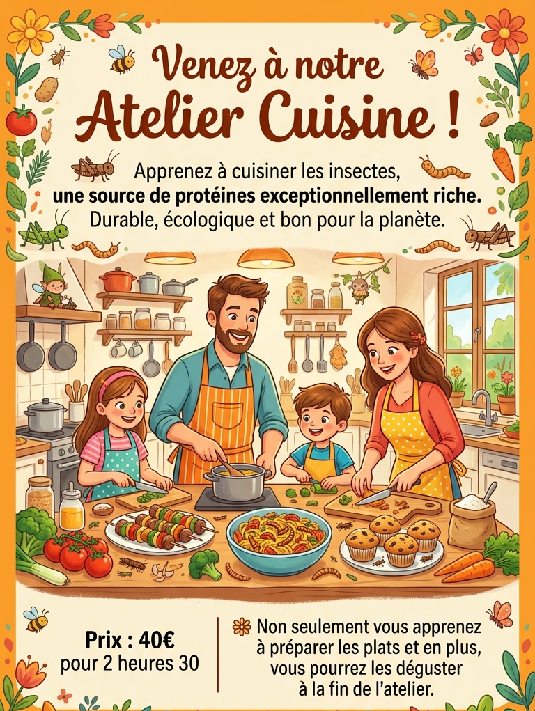 Des ateliers de cuisine vont être organisés pour apprendre comment utiliser les insectes comestibles au quotidien pour enrichir son alimentation à l'aide de protéines naturelles. Venez découvrir des bonnes recettes à base d'insectes !